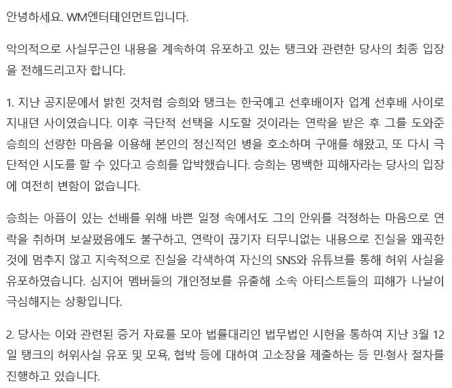 25일 오마이걸 소속사 WM엔터테인먼트는 오마이걸 공식 팬카페에 "승희는 명백한 피해자라는 당사의 입장에 여전히 변함이 없다"며 "당사는 관련 증거 자료를 모아 법률대리인 법무법인 시헌을 통해 3월 12일 탱크의 허위사실 유포 및 모욕, 협박 등에 대해 고소장을 제출하는 등 민·형사 절차를 진행 중"이라고 밝혔습니다.