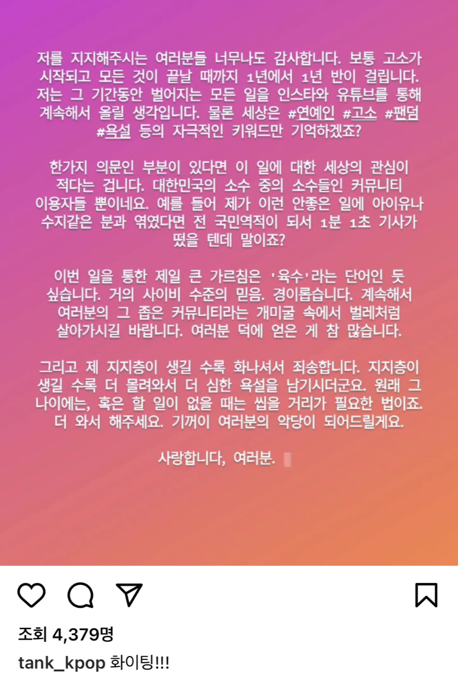 탱크는 26일 자신의 인스타그램에 8분 가량의 영상을 올렸습니다. "어제 발표된 입장을 표명한 것에 대해서는 그들이 마치 나를 고소하는 것을 망설여왔습니다. 하지만 이제는 참을 수 없어 고소했다는 식으로 이야기를 했다"고 전했습니다.