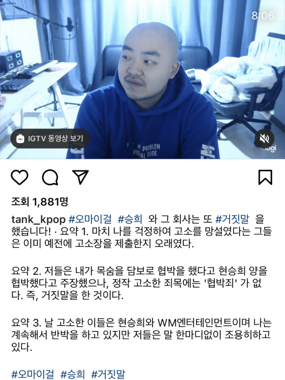 탱크는 승희를 향한 폭로를 멈추지 않았습니다. 특히 탱크는 24일 극단적인 선택을 예고해 파장이 커지는가 하면 WM엔터테인먼트 측의 입장문 이후 '오마이걸 승희와 그 회사는 또 거짓말을 했다'며 영상을 게재했습니다.