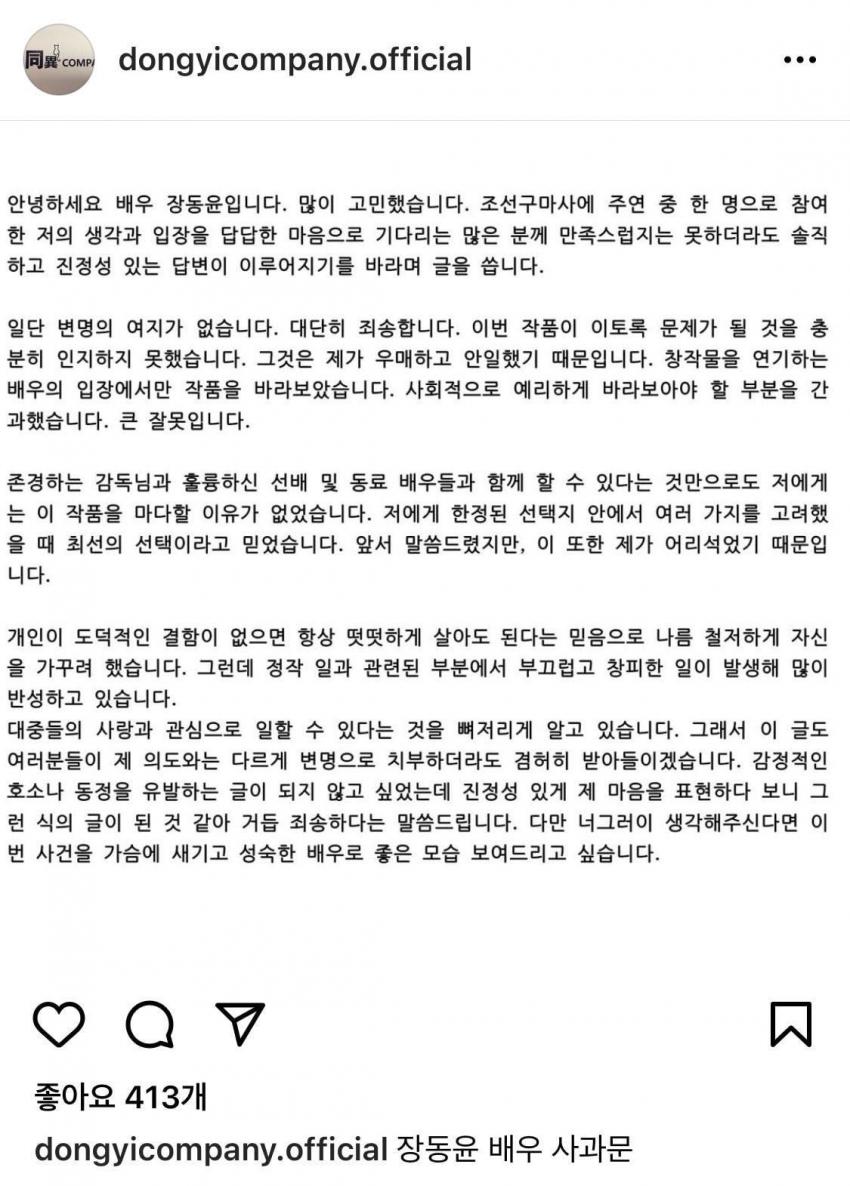 27일 오전 장동윤은 소속사 동아컴퍼니 인스타그램을 통해 사과문을 남겼습니다. 사과문에서 장동윤은 "많이 고민했다. '조선구마사'에 주연 중 한 명으로 참여한 저의 생각과 입장을 답답한 마음으로 기다리는 많은 분께 만족스럽지는 못하더라도 솔직하고 진정성 있는 답변이 이루어지기를 바라며 글을 쓴다"고 말문을 열었습니다.