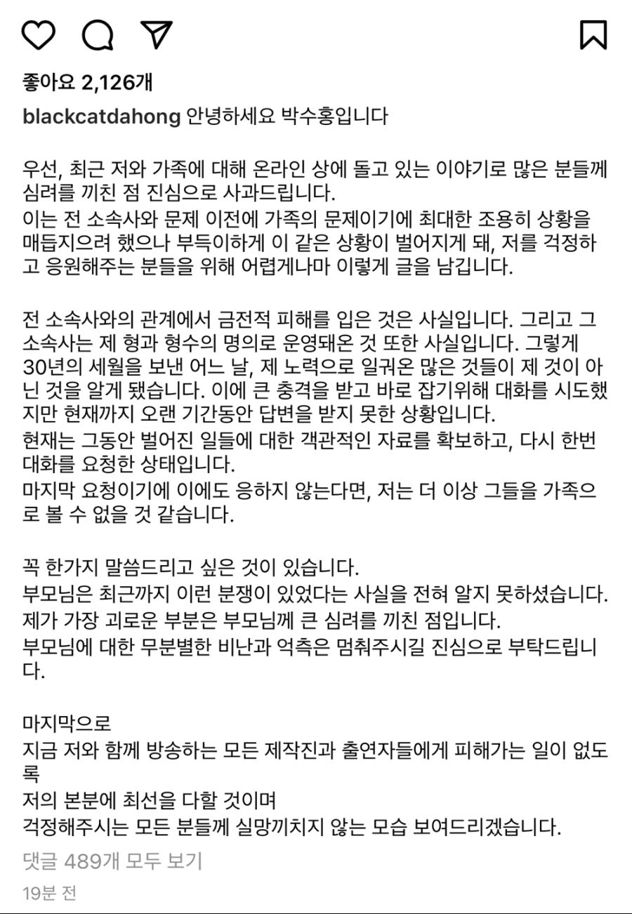 박수홍은 오늘 29일 자신이 운영하는 반려묘 다홍이 인스타그램에 입장문을 올렸습니다.