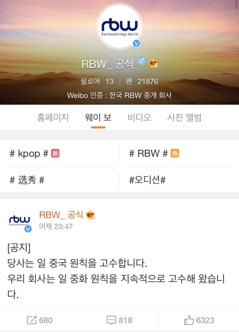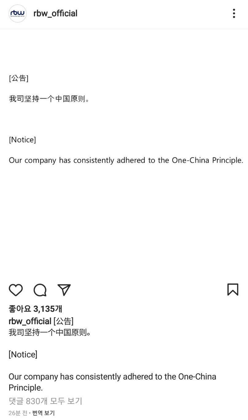 31일 새벽 RBW 공식 인스타그램과 웨이보에는 "우리 회사는 하나의 중국 원칙을 지지한다"라는 내용의 글이 영어와 중국어로 게재되었습니다.