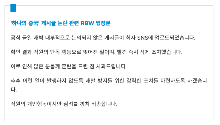 RBW 측은 '내부 직원의 단독 행동으로 빚어진 일'이라고 즉각 해명했습니다.