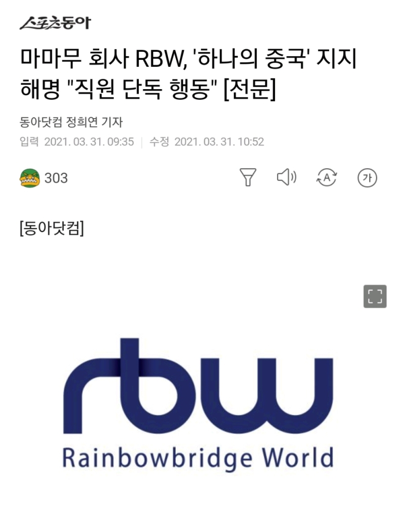 <RBW 해명 마마무 소속사 하나의 중국 지지 논란 입장문>