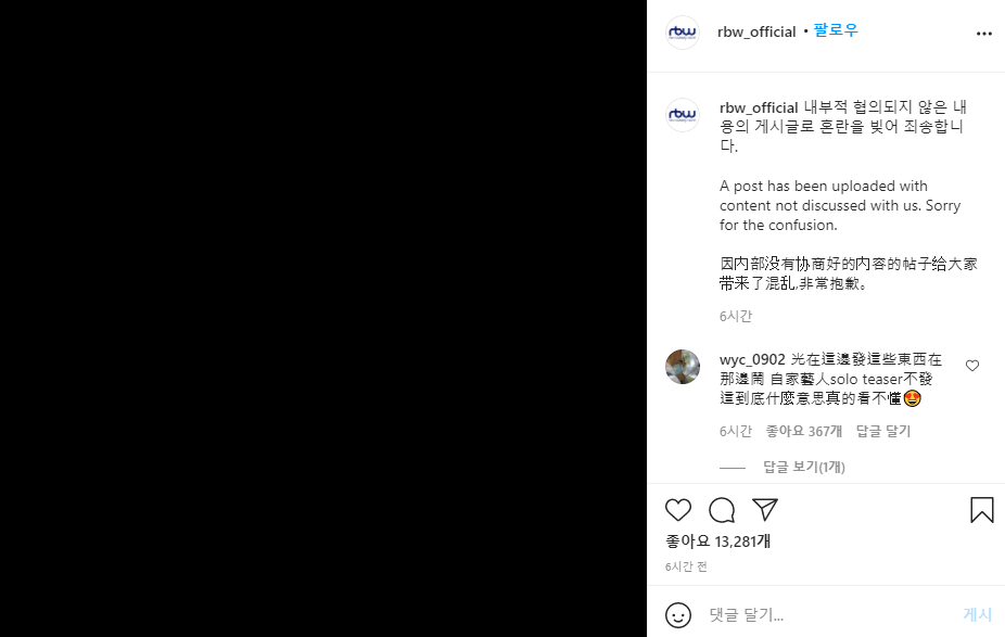 RBW 측은 31일 오전 "금일 새벽 내부적으로 논의되지 않은 게시글이 회사 SNS에 업로드됐다"라며 "확인 결과 직원의 단독 행동으로 빚어진 일이다. 이로 인해 많은 분께 혼란을 드린 점 사과드린다"고 고개를 숙였습니다.