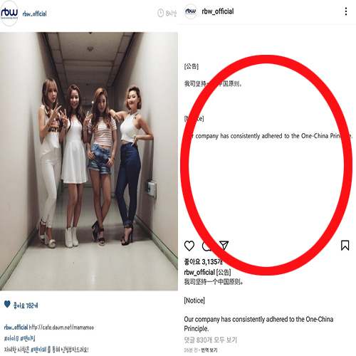 그룹 마마무 소속사 RBW가 공식 SNS에 '하나의 중국'을 지지하는 글을 올렸다가 삭제하면서 논란의 중심에 섰습니다.