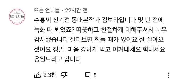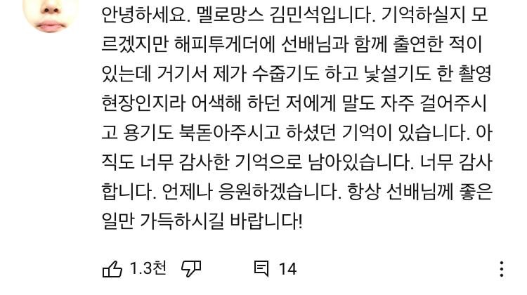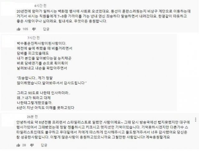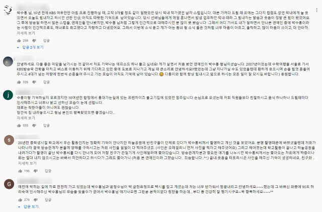 방송사에서 박수홍을 실제로 겪은 방송계 관계자들이 댓글도 있었습니다. 한 누리꾼은 "KBS '여유만만' 진행하실 때, 고작 3개월 정도 같이 일했던 막내 작가다. 대본 가져다 드릴 때 외에는 그다지 접점도 없던 막내에게 늘 웃으면서 '오늘도 힘내자'고 하시던 선한 인상, 아직도 따뜻한 기억으로 남아있다"고 적었습니다.