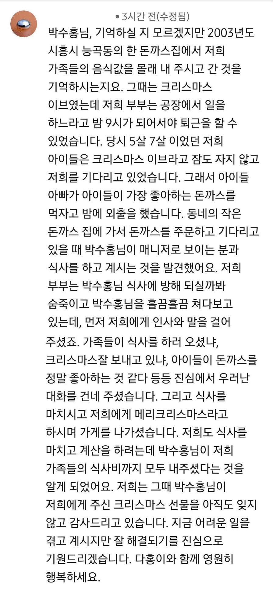 31일 박수홍의 유튜브 계정 최근 게시물에는 누리꾼들의 위로 댓글이 1만 여 건 달렸습니다. 그 중 일부 누리꾼은 자신이 직접 겪은 박수홍의 미담을 밝혀 눈길을 끌었습니다.