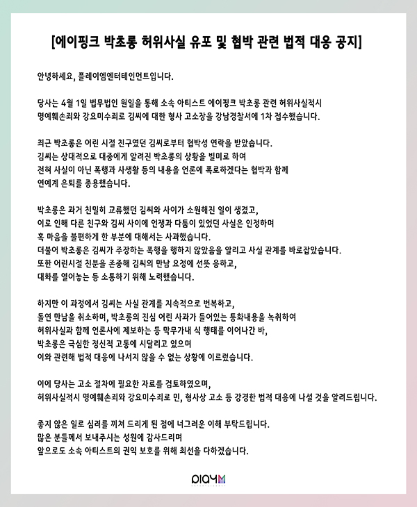 에이핑크 박초롱이 학폭 가해 의혹이 제기된 가운데, 박초롱 소속사 플레이엠엔터테인먼트 측이 피해자라고 주장하는 동창생 A씨의 행동에 대해 "명백한 흠집내기"라고 말했습니다.