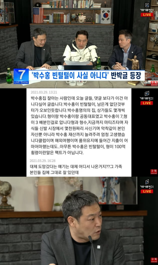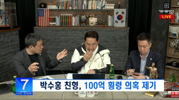 가세연 김홍호는 "박수홍의 형이 횡령을 했는데 사생활을 왜까냐는 악플이 있다. 형이 횡령을 했다는 건 여자친구의 댓글이다. 그 댓글에 증거가 있나? 여자친구와 의견에 동조한 박수홍의 주장일 뿐이지, 형이 횡령했다는 증거도 없다"면서 "형이 횡령으로 의심을 받자 법인 통장부터 보안 카드까지 법에 대한 걸 넘겨준 지 오래전"이라고 말했습니다.