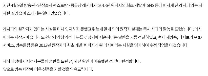 편스토랑측은 "레시피의 원작자가 있다는 사실을 미처 인지하지 못했고 뒤늦게 알게 되어 원작자 분께는 즉시 사과의 말씀을 드렸다"며 "레시피에는 저작권이 없더라도 원작자의 창의성에 누를 끼쳤기에 죄송하다는 말씀을 거듭 전달했고, 현재 재방송, 다시보기 VOD서비스, 방송클립 등은 2013년 원작자의 초초 개발 후 퍼지게 된 레시피라는 사실을 명기하여 수정 작업을 마쳤다"고 전했습니다.
