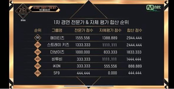 하지만 방송 후, 일부 누리꾼들은 점수 계산법에 오류가 있다고 지적했습니다. 에이티즈의 전문가 점수는 1555.556점, 자체평가 점수는 1388.889점인데 합산 점수가 2944.445가 아닌 2944.444라는것입니다.