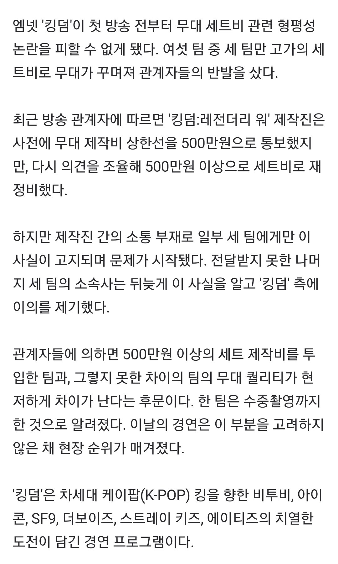 이번 킹덤 측의 제작비 공정성 논란은 제작진에게 책임이 있는 것이지, 아티스트들에게 책임이 있는 것은 아닌데요, 하지만 시청자들의 눈에도 띌 정도로 차이가 상당한 무대가 나와 1차 경연에서 이로 인한 이득, 또는 피해가 발생하지 않을 거라고 장담할 수 없는 상황입니다.