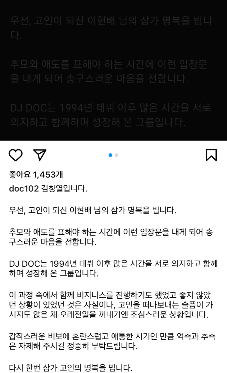 김창열은 "DJ DOC는 1994년 데뷔 이후 많은 시간을 서로 의지하고 함께하며 성장해 온 그룹이다. 이 과정 속에서 함께 비지니스를 진행하기도 했었고 좋지 않았던 상황이 있었던 것은 사실이나, 고인을 떠나보내는 슬픔이 가시지도 않은 채 오래전 일을 꺼내기에 조심스러운 상황"이라고 설명했습니다.