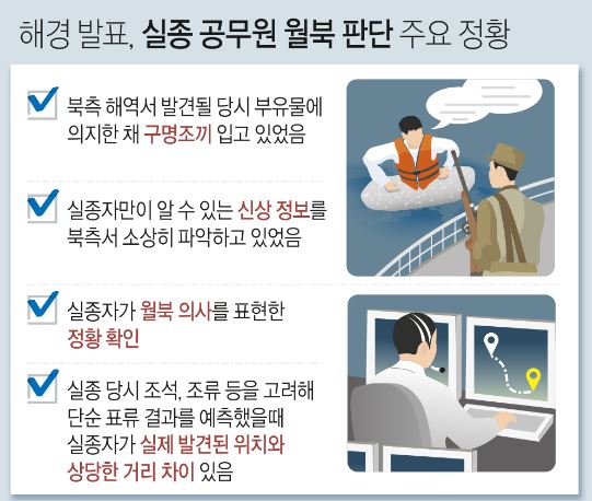첫째, 실종자가 북측 해역에서 발견될 당시 탈진된 상태로 부유물에 의지한 채 구명조끼를 입고 있었던 사실, 둘째 실종자만이 알 수 있는 본인의 이름, 나이, 고향, 키 등 신상정보를 북측에서 소상히 파악하고 있었던 사실, 셋째, 실종자가 월북 의사를 표현한 정황 등을 확인했습니다.