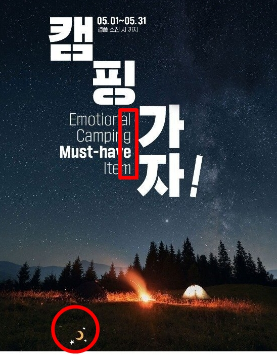 포스터에는 '캠핑가자'라는 문구와 함께 소시지를 잡고 있는 손 모양이 일러스트로 연출되었습니다. 또 '이모셔널(Emotional)', '캠핑(Camping)', '머스트-해브(Must-have)', '아이템(Item)'이라는 문구도 포함되었습니다.