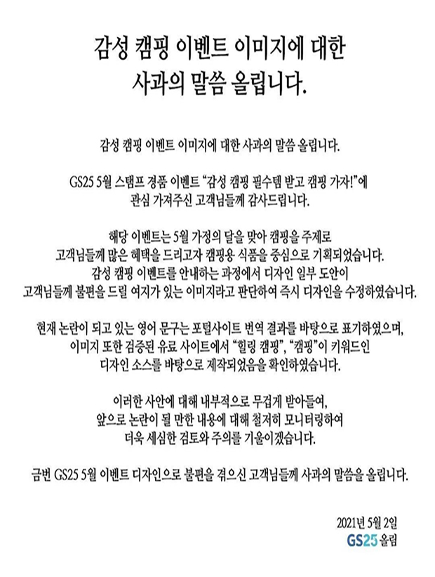 논란이 커지자 GS25는 사과문을 올렸습니다. GS25는 "내부적으로 무겁게 받아들여 앞으로 논란이 될 만한 내용에 대해 철저히 모니터링해 더욱 세심한 검토와 주의를 기울이겠다"고 밝혔습니다.