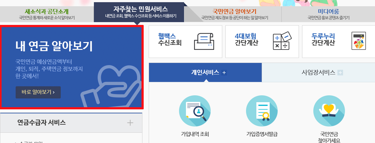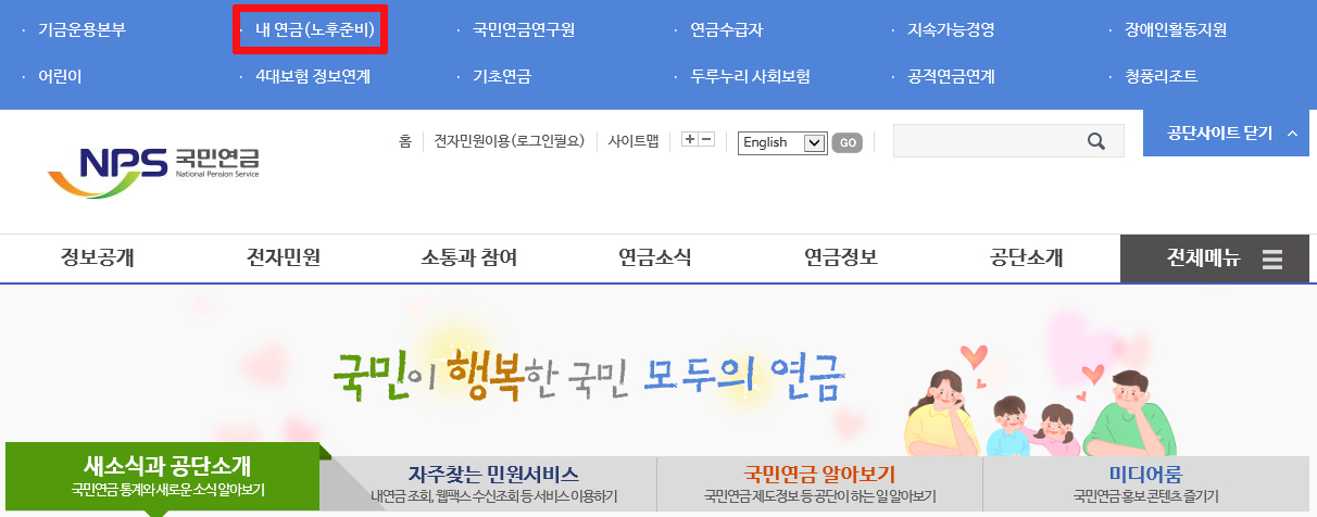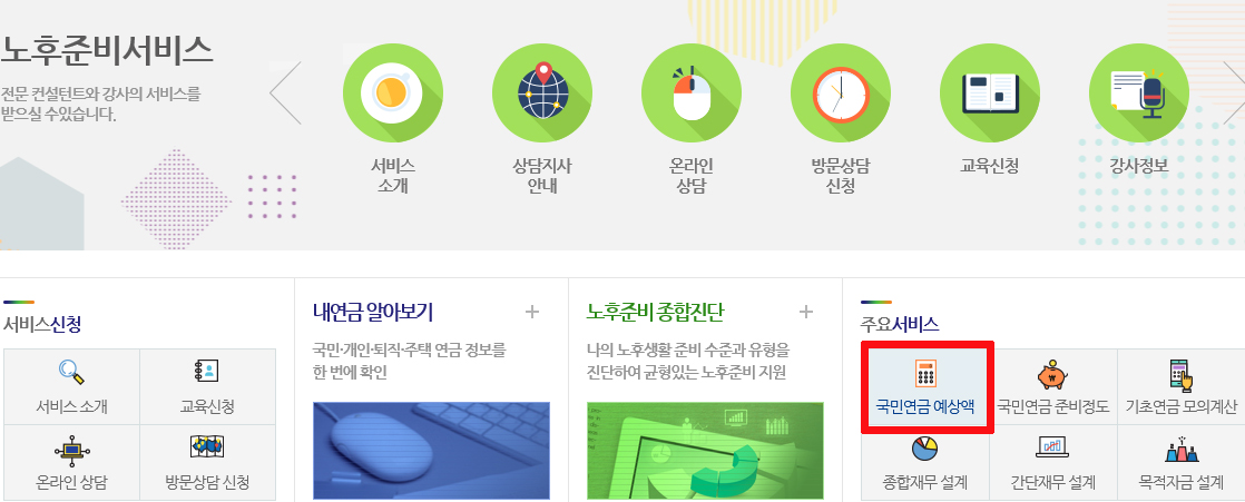 국민연금 예상수령액을 조회해 볼 수 있는 방법은 국민연금공단 홈페이지에 접속후 > 화면 메인 상단에 있는 '내 연금(노후준비)'를 클릭하시면 됩니다.