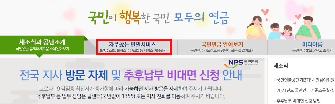 국민연금 납부액 조회방법은 국민연금공단 홈페이지 접속 후 메인화면에서 '자주찾는 민원' > 하위 카테고리에서 '가입·납부내역 조회' 탭으로 넘어가시면 됩니다.