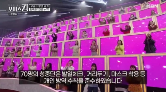 출연진 90여 명은 물론, 심사위원을 비롯해 70여 명의 청중단이 스튜디오 녹화에 참여하였는데요, 참가자들은 무대 위에서 노래는 물론, 댄서들과 안무까지 소화하고 70여 명에 이르는 청중단은 마스크 없이 환호성을 지르기도 합니다.