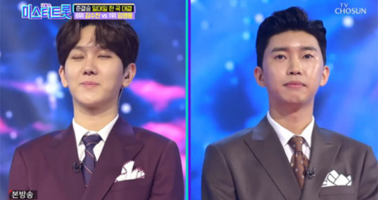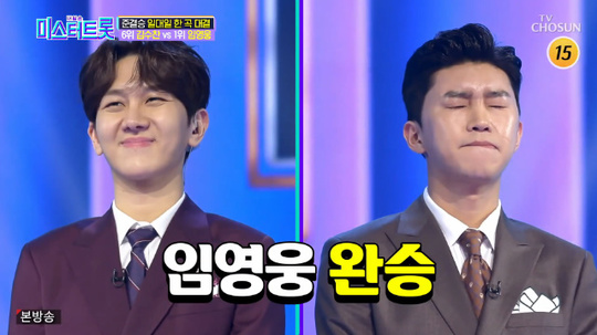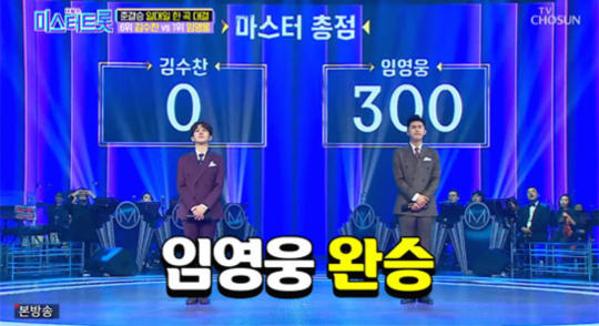 임영웅과 가수 주현미의 '첫정'으로 레전드 미션 대결을 벌인 김수찬은 마스터 점수 300점 중 0점을 받으며 완패해 결승 진출에 실패했습니다.