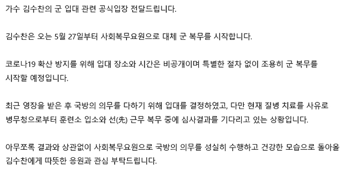이어 "코로나19 확산 방지를 위해 입대 장소와 시간은 비공개이며 특별한 절차 없이 조용히 군 복무를 시작할 예정"이라고 설명했습니다.