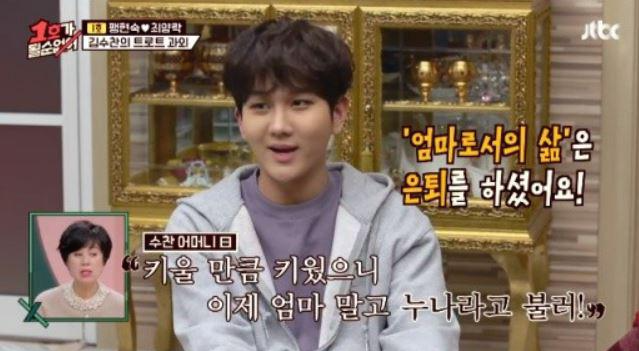 김수찬은 '1호가 될 순 없어'에 출연해 엄마를 누나라고 부르는 사연을 공개해 화제가 되기도 했습니다.