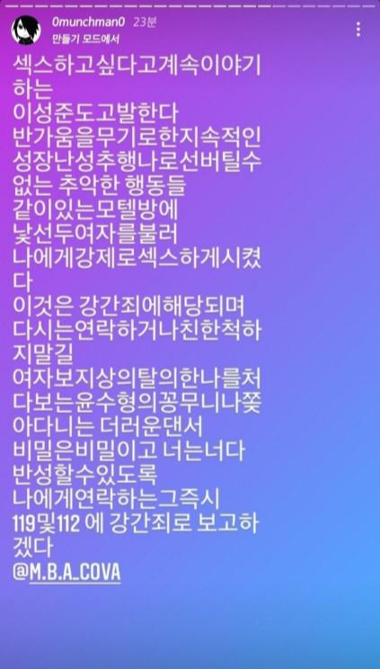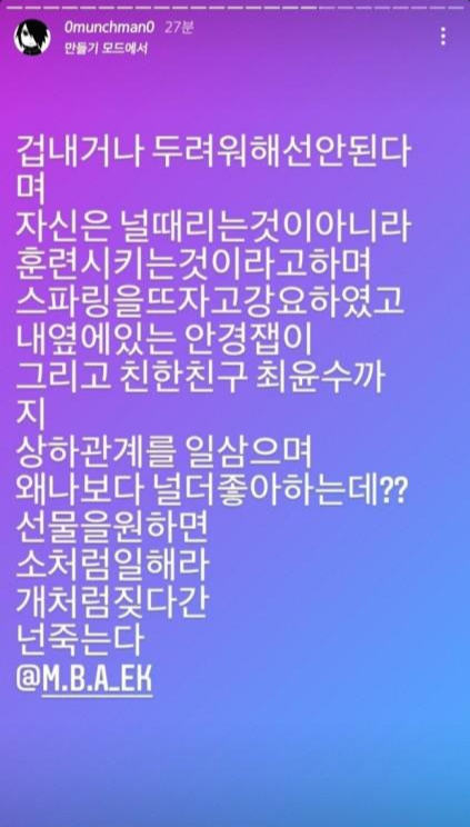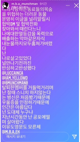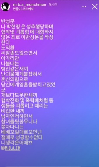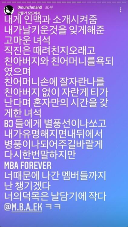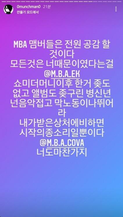 먼치맨은 앞서 지난달 29일 인스타그램을 통해 래퍼 EK, 비프리등을 저격했습니다. EK가 자신에게 욕설과 폭행을 일삼고, 자신의 활동을 강압적으로 진행했다는 내용이었는데요, 또한 MBA 멤버 코바가 자신과 누군지도 모르는 두 명의 여성을 모텔방으로 불러 성관계를 갖게 시켰다고 폭로했습니다.
