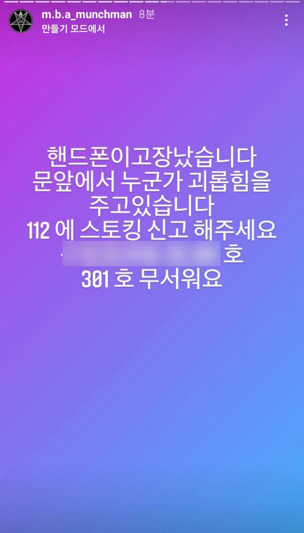 해당 사건을 최초 보도한 MBN에 따르면 먼치맨은 인스타그램에 누군가 자신을 스토킹 한다는 게시글을 올렸고 이를 본 팬들이 경찰에 신고한 것으로 확인되었습니다.