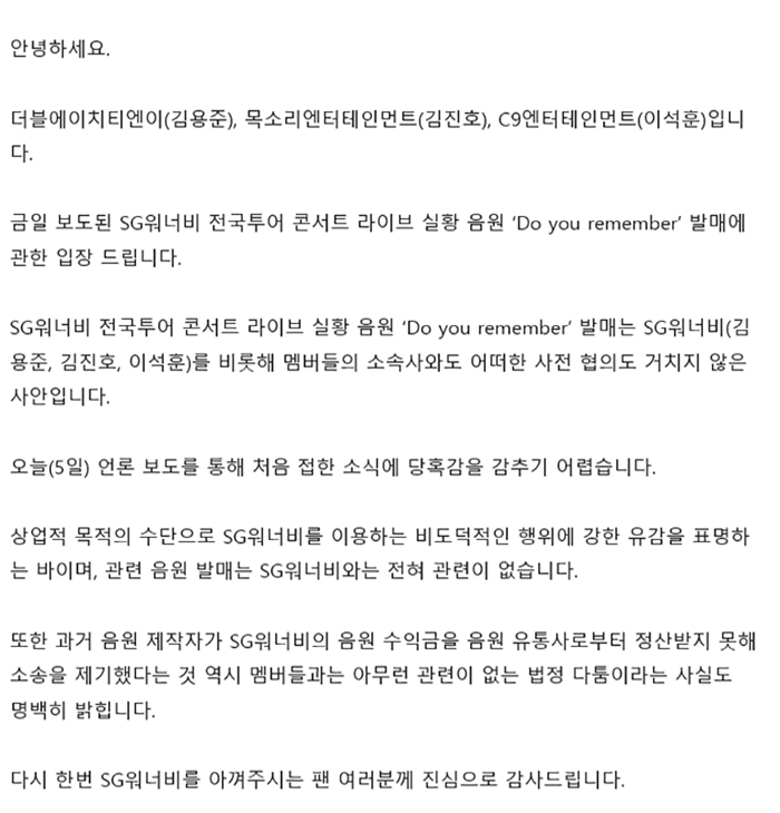 또한 이번 실황 음원 발표 계획과 함께, 음원제작자가 유통사에 제기한 음원수익금 소송 등 일련의 것들이 SG워너비 멤버들과 관련이 없는 사실임을 명확이 하고 있습니다.