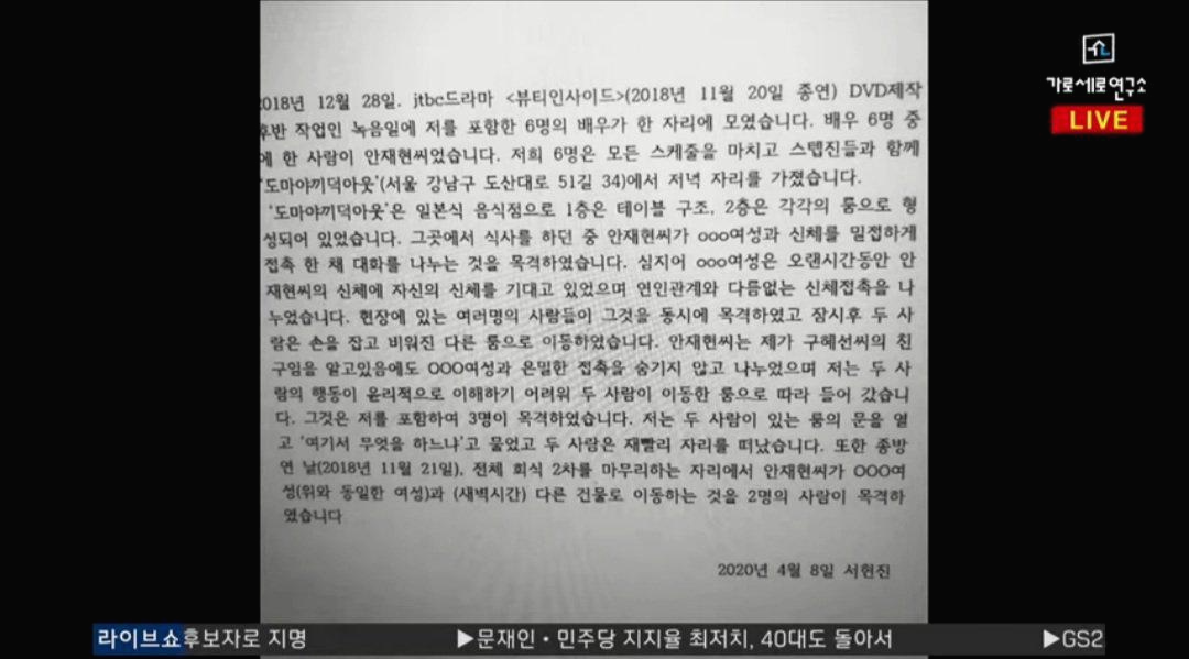 가세연 측은 "안재현과 구혜선의 이혼 소송 과정에서 누군가가 안재현의 외도 사실을 확인하기 위해 작성한 사실 확인서로 추정되는 문서를 확보를 했고 자세한 내용을 공개한다"라고 밝혔습니다.