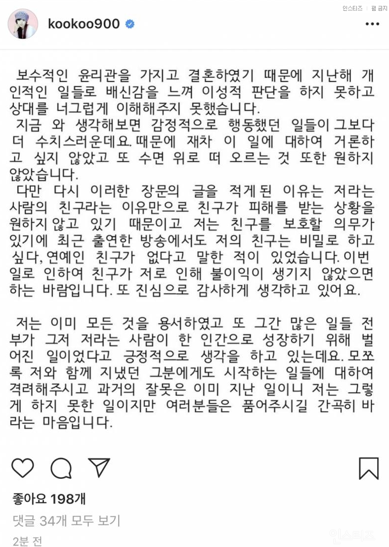 구혜선은 "저라는 사람의 친구라는 이유만으로 피해받는 상황을 원하지 않는다. 친구가 저로 인해 불이익이 생기지 않았으면 하는 바람"이라고 전했습니다.