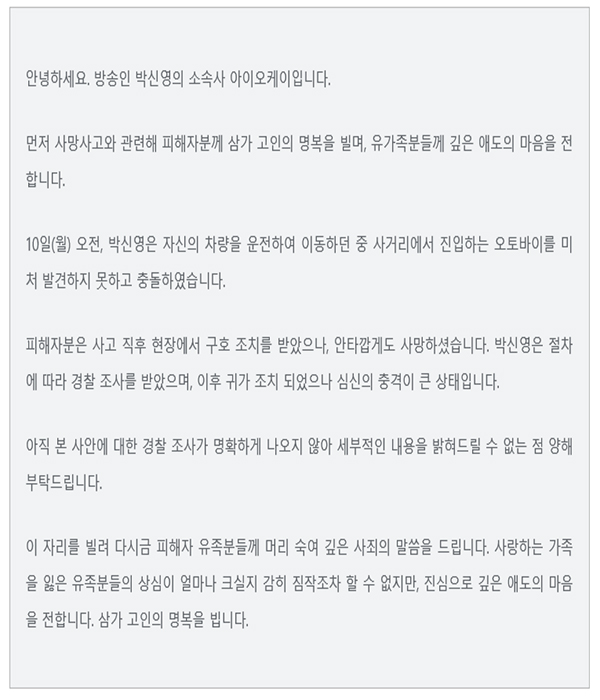 이어 "차량을 운전해 이동하던 중 사거리에서 진입하는 오토바이를 미처 발견하지 못하고 충돌했습니다. 피해자분은 사고 직후 현장에서 구호 조치를 받았으나 안타깝게도 사망했습니다. 박신영은 절차에 따라 조사를 받았으며 이후 귀가 조치됐으나 심신의 충격이 큰 상태입니다"라고 설명했습니다.
