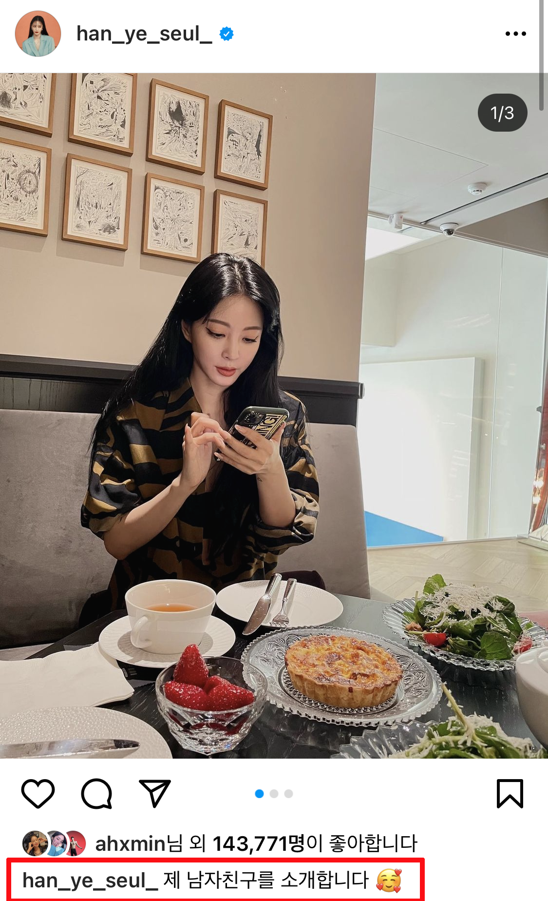 한예슬은 14일 자신의 인스타그램에 "제 남자친구를 소개합니다"라는 설명과 함께 한식당에서 함께 식사를 한 남성의 사진을 공개했습니다.