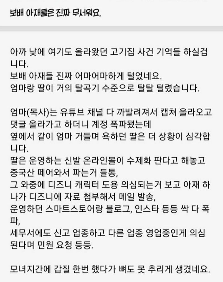 온라인 커뮤니티에 올라온 글에 따르면 양주 고기 집 갑질모녀의 목사 어머니는 유튜브가 알려졌으며, 딸은 수제화를 판다면서 중국산 제품을 떼와서 파는 것이 들통났다고 합니다.