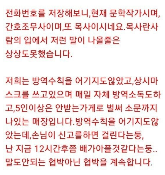 뒤늦은 항의에 사장은 사과를 했지만 소용없었습니다. 이후 가게를 나간 모녀 중 어머니인 A씨가 전화를 걸어 "화가 나니 고깃값을 환불해달라"는 요구와 함께 폭언을 쏟아냈으며, 방역 수칙을 어겼으니 신고하겠다는 등 협박도 서슴지 않았습니다.