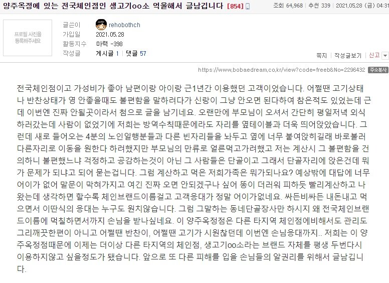 양주 고기 집 사장 부부를 상대로 '환불해달라'면서 행패를 부렸던 모녀가 이 사연이 알려졌던 커뮤니티 '보배드림'에도 억지성 모함글을 올렸던 것으로 나타났습니다.