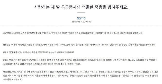 청와대 국민청원 게시판에는 '사랑하는 제 딸 공군 중사의 억울한 죽음을 밝혀달라'는 제목의 글이 올라오기도 했습니다.
