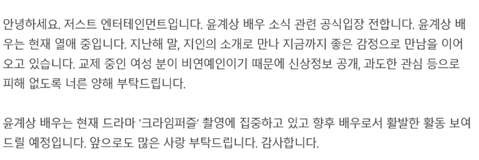 이어 "교제중인 여성분이 비연예인이기 때문에 신상정보 공개, 과도한 관심 등으로 피해 없도록 너른 양해 부탁드린다"고 덧붙였습니다.