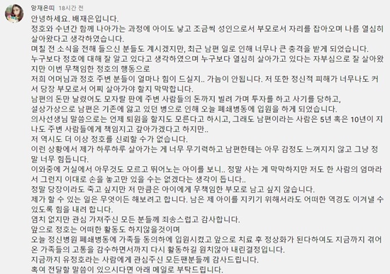이어 "화장품을 팔며 생활비에는 문제가 없었으나 화장품이 안 팔리는 달에는 가장으로서 압박감과 책임을 다하지 못한다는 생각이 들었고 돈을 더 불려야겠다는 생각에 바보같이 주식과 도박을 알게 됐고 그러면 안 되는 걸 알면서도 손을 댔다"고 말했습니다.