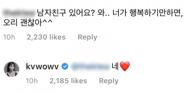 한 누리꾼이 "남자친구 있어요? 네가 행복하기만 하면 우린 괜찮아"라는 댓글을 달자, 권민아는 "네♥"라고 답하며 열애를 인정하는 모습을 보였습니다.