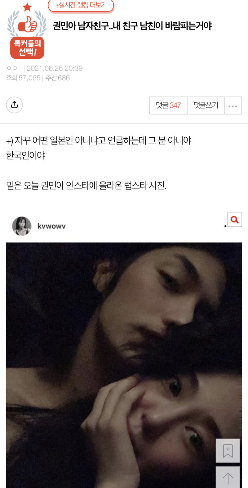 26일 온라인 커뮤니티 네이트판에는 '권민아 남자친구.. 내 친구 남친이 바람피는 거야'라는 제목의 글이 올라왔는데요, 작성자 A씨는 이날 공개된 권민아의 인스타그램 사진 속 남성에 대해 "내 친구랑 1,000일 앞둔 시점에서 갑자기 남친이 연락이 뜸해지고 잠수 타더니 권민아 계정에 럽스타가 올라왔다"고 주장했습니다.