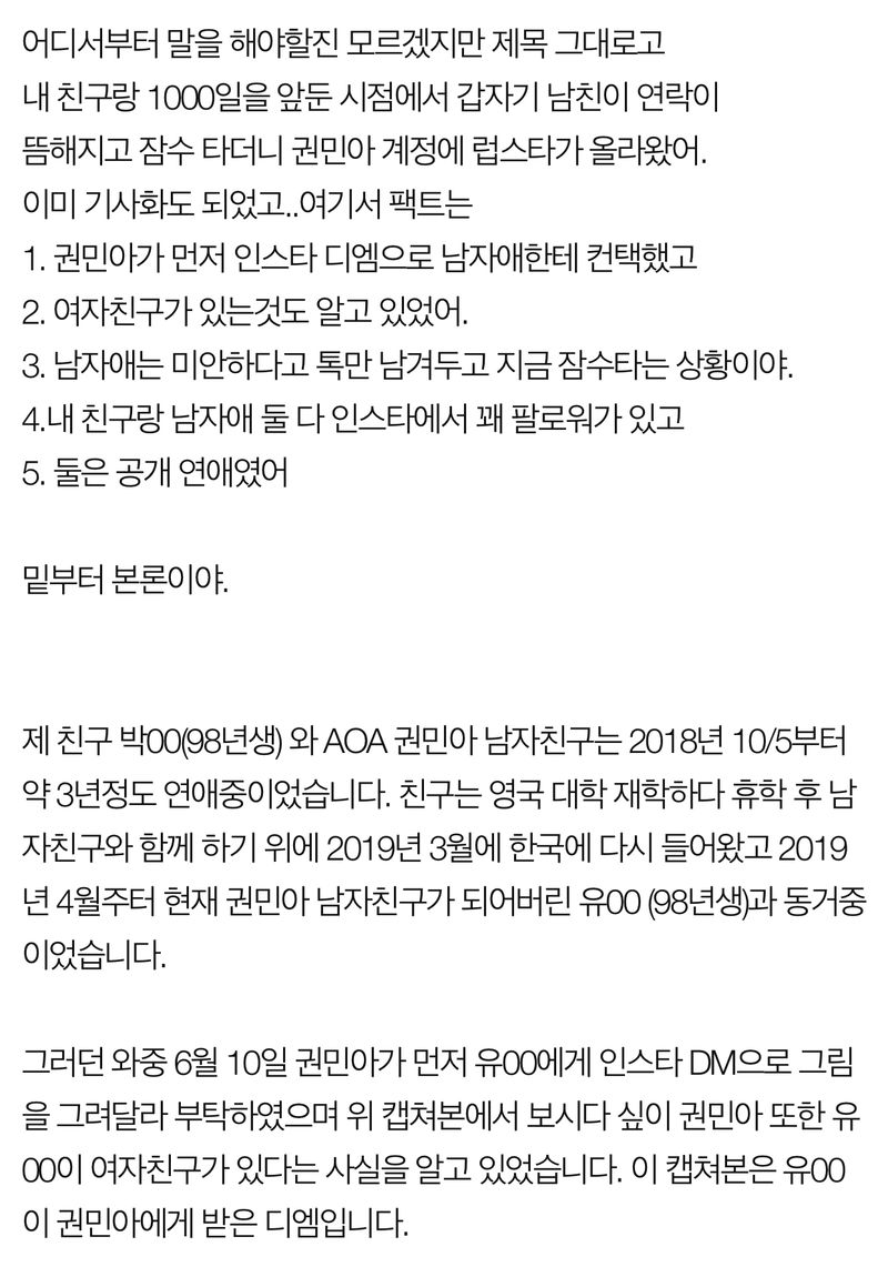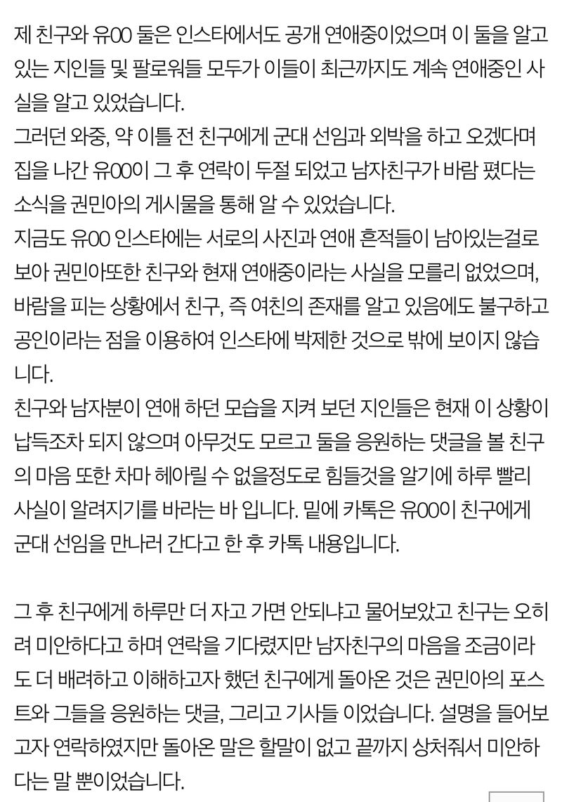 권민아는 "제가 지금 만나고 있는 남자친구의 전 여자친구의 친구분이 올리신 글인지 모르겠지만 이런 걸로 제가 또 욕을 먹고 일반인인 남자친구에게도 피해가 안 갔으면 해서 글을 올린다"고 말문을 열며, 폭로 글 내용중 인스타그램 디엠 선톡 여부가 논란이 되자 재차 관련 글을 업로드하기도 했습니다.