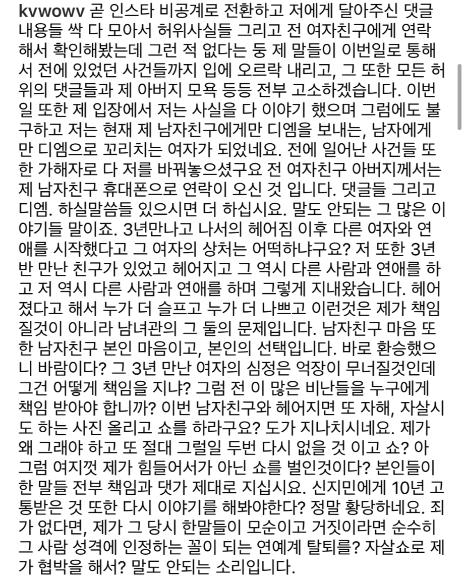 곧 인스타 비공계로 전환하고 저에게 달아주신 댓글 내용들 싹 다 모아서 허위사실들 그리고 전 여자친구에게 연락해서 확인해봤는데 그런 적 없다는 둥 제 말들이 이번일로 통해서 전에 있었던 사건들까지 입에 오르락 내리고, 그 또한 모든 허위의 댓글들과 제 아버지 모욕 등등 전부 고소하겠습니다.