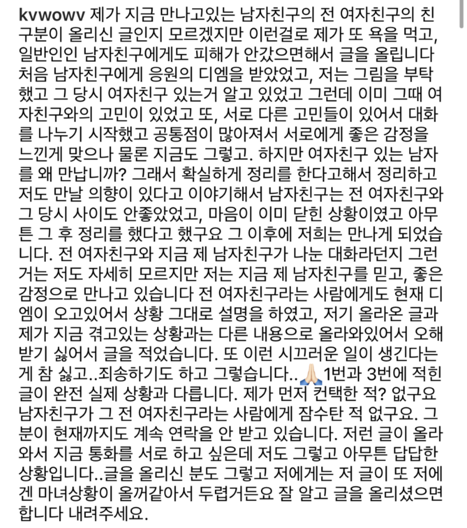 권민아의 남자친구 또한 "전 여자친구에게 전화로 이별로 통보했고 이후 민아와 연애를 했다. 지금 일어나는 상황 때문에 전화 시도도 해봤지만 연락을 받지 않는다. 사실과 다른 이야기들이 퍼지지 않았으면 좋겠다"고 관련 입장을 전했습니다.