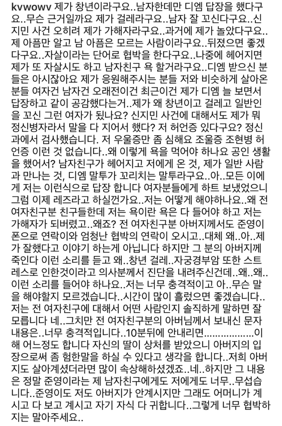 왜 전 여자친구분 친구들한테 저는 욕이란 욕은 다 들어야 하고 저는 가해자가 되버렸고.. 왜죠? 전 여자친구분 아버지께서도 준영이 폰으로 연락이와 엄청난 협박의 연락이 오시고.. 대체 왜.. 아.. 제가 잘했다고 이야기 하는게 아닙니다 하지만 그 분의 아버지께 죽인다 이런 소리를 듣고 왜.. 창X 걸X.. 자궁경부암 또한 스트레스로 인한것이라고 의사분께 진단을 내려주신건데.. 왜.. 왜.. 이런 소리를 들어야 하나요..