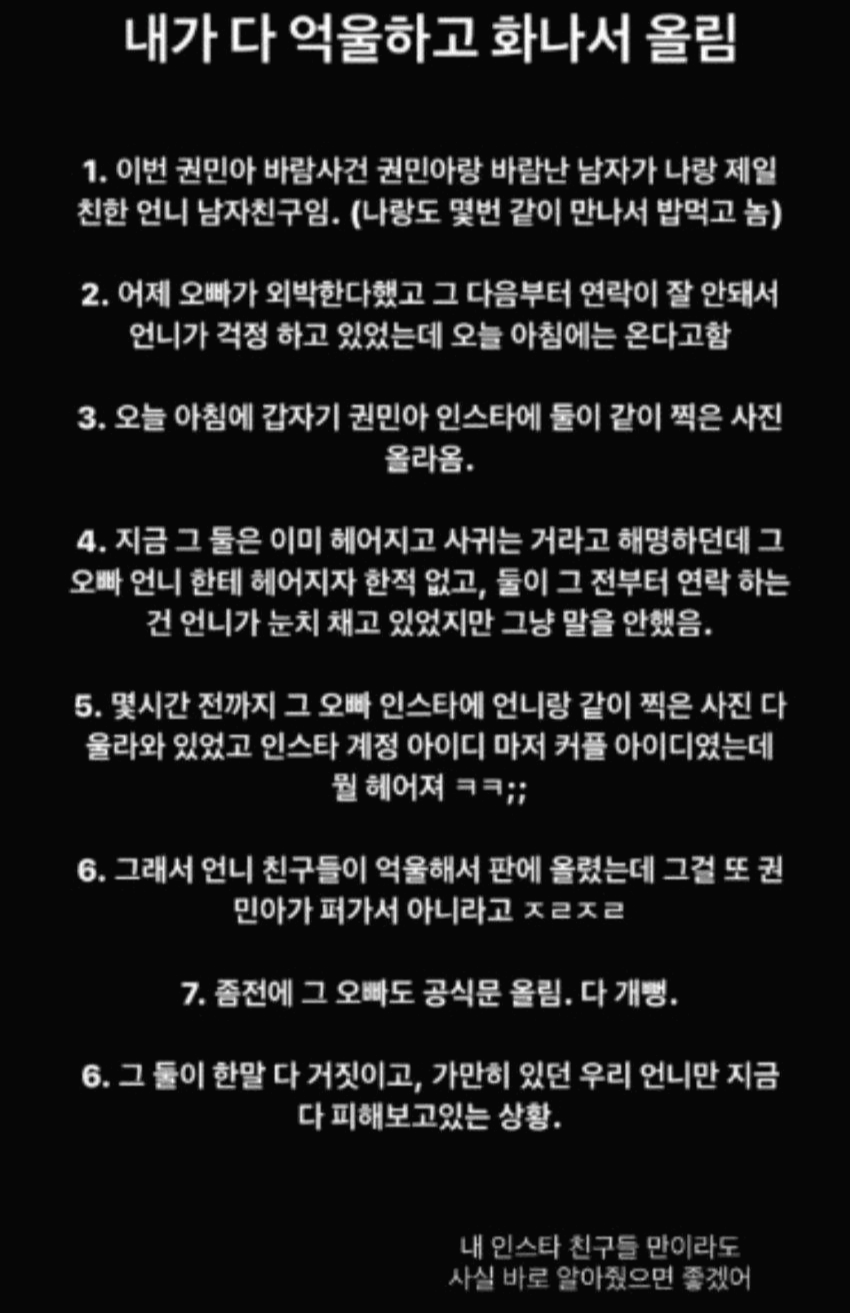 권민아의 남자친구 또한 "전 여자친구에게 전화로 이별로 통보했고 이후 민아와 연애를 했다. 지금 일어나는 상황 때문에 전화 시도도 해봤지만 연락을 받지 않는다. 사실과 다른 이야기들이 퍼지지 않았으면 좋겠다"고 관련 입장을 전했습니다.