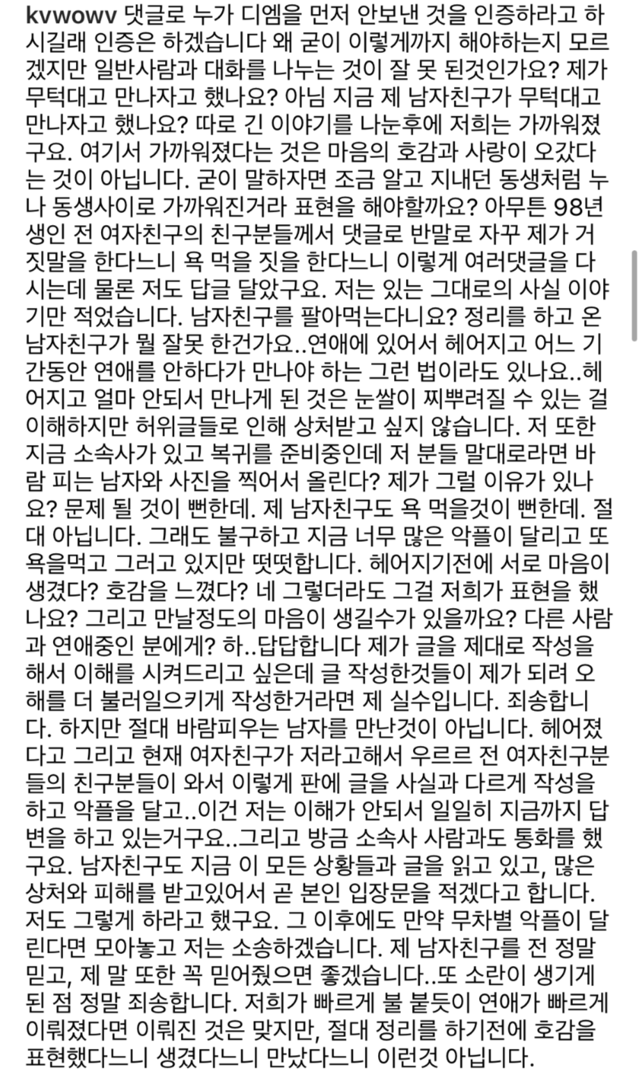 바람의 정의를 모른다고 하셨죠? 저 보고 바람폈다고 지금 전 여자친구분의 지인들이 저에게 온갖 댓글 다셨죠? 그럼 먼저 고소든 뭐든 하지면 되잖아요. 제가 잘못한게 있다면 본인들이 생각하시는 제 잘못들이 뭐가 그리 많으신지 모르겠지만 소송이든 뭐든 하시면 되겠네요.