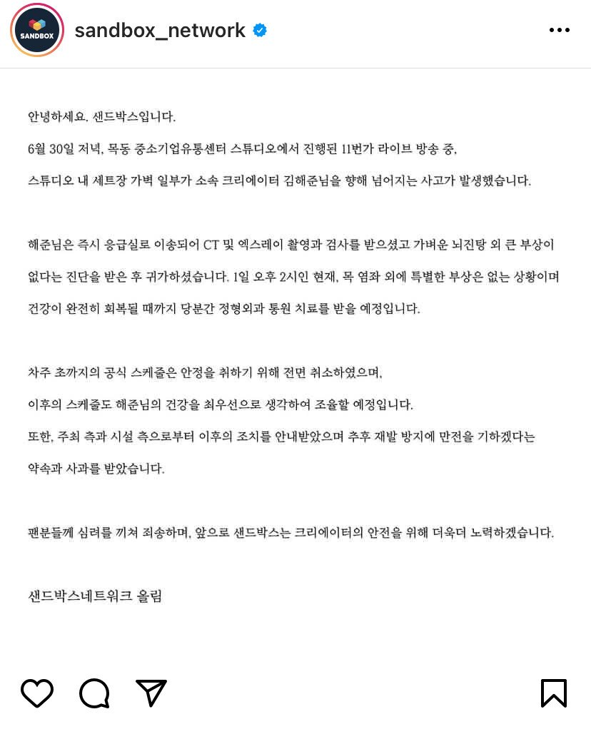 이와관련 11번가 라이브 담당자는 "김해준님은 사고 발생 직후 바로 병원으로 가셨고, 현재 필요한 치료를 받고 계신 것까지 상황 확인했습니다"라며 "추후 건강상태에 대해서는 따로 공지 드릴 수 있도록 하겠습니다"라고 밝혔습니다.
