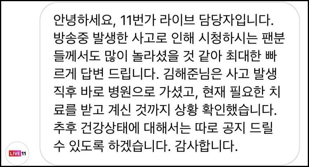 이와관련 11번가 라이브 담당자는 "김해준님은 사고 발생 직후 바로 병원으로 가셨고, 현재 필요한 치료를 받고 계신 것까지 상황 확인했습니다"라며 "추후 건강상태에 대해서는 따로 공지 드릴 수 있도록 하겠습니다"라고 밝혔습니다.